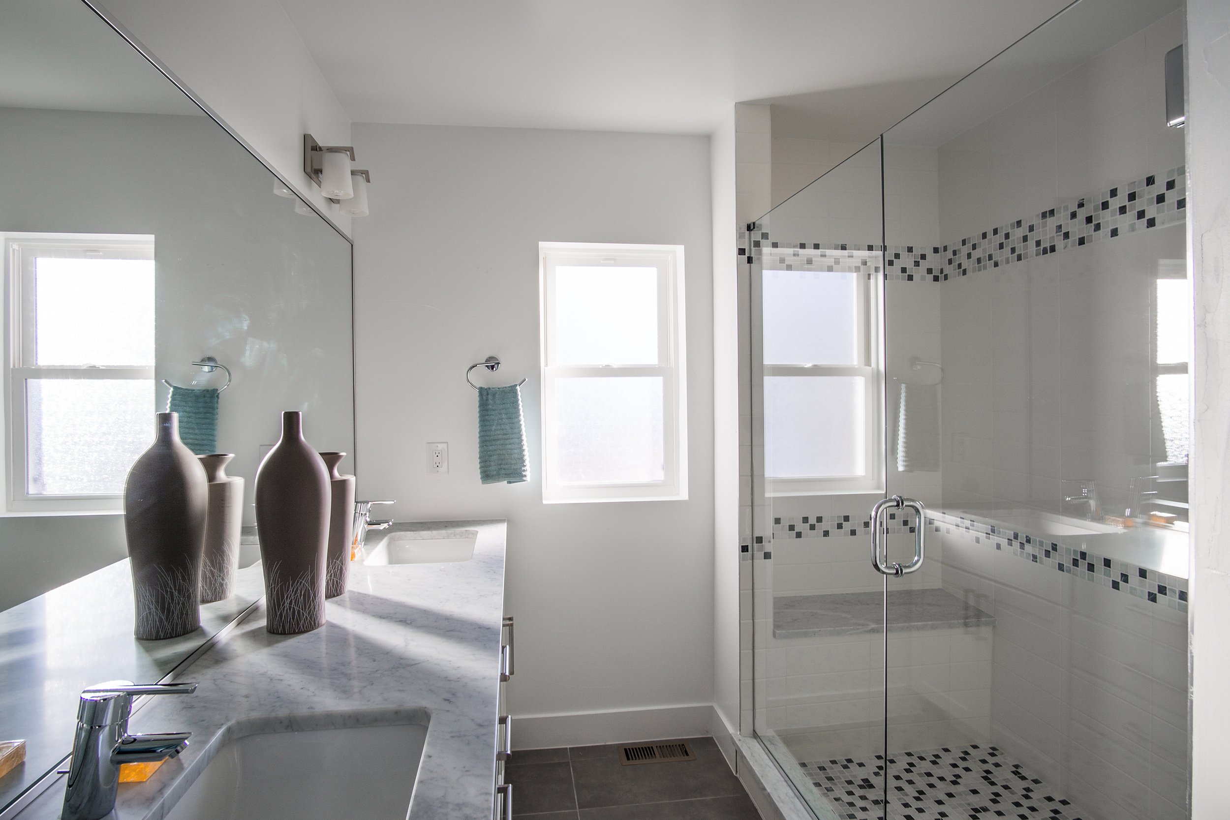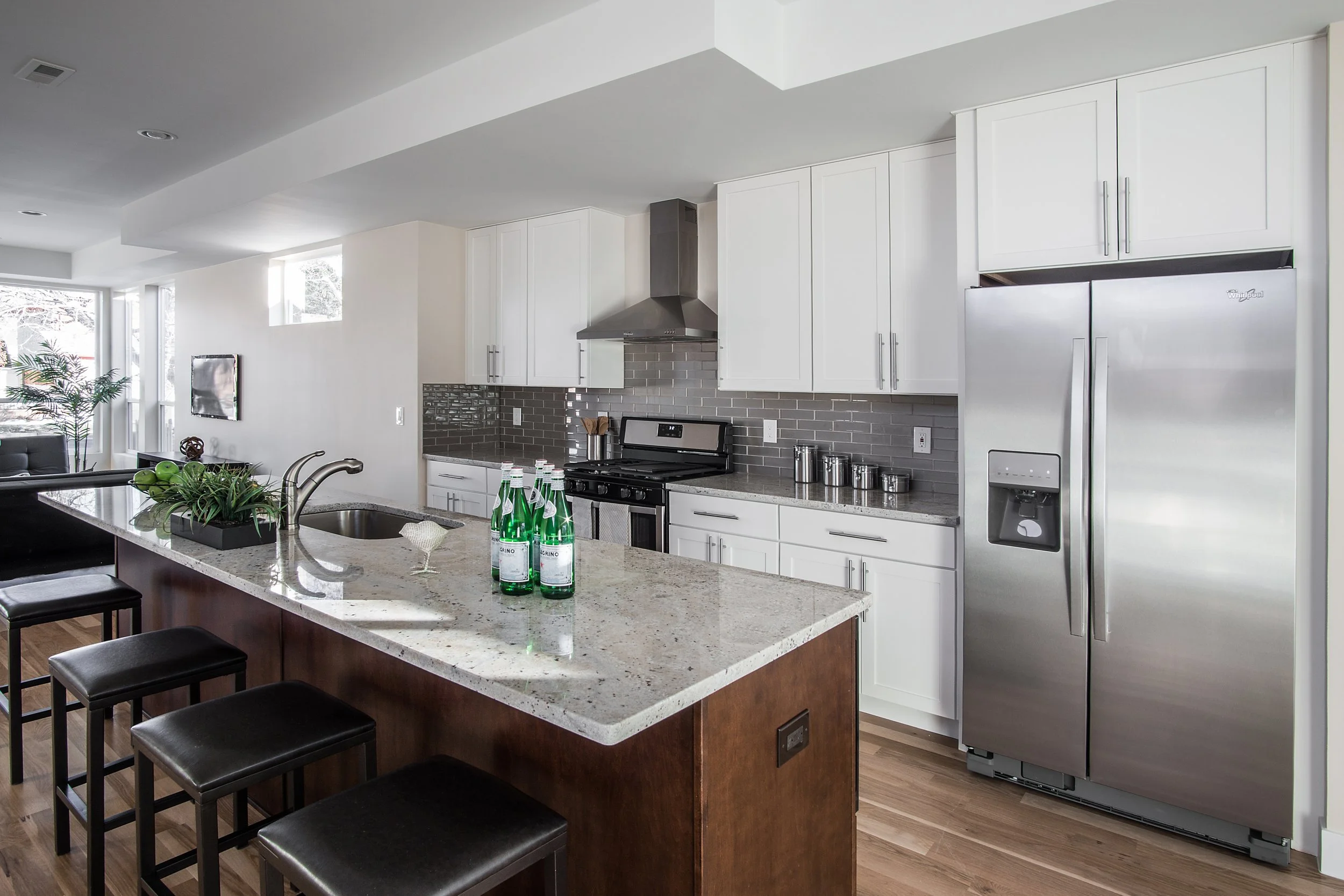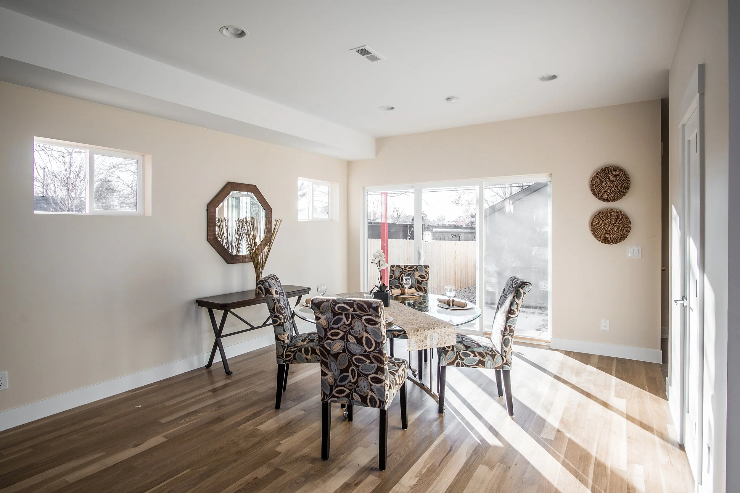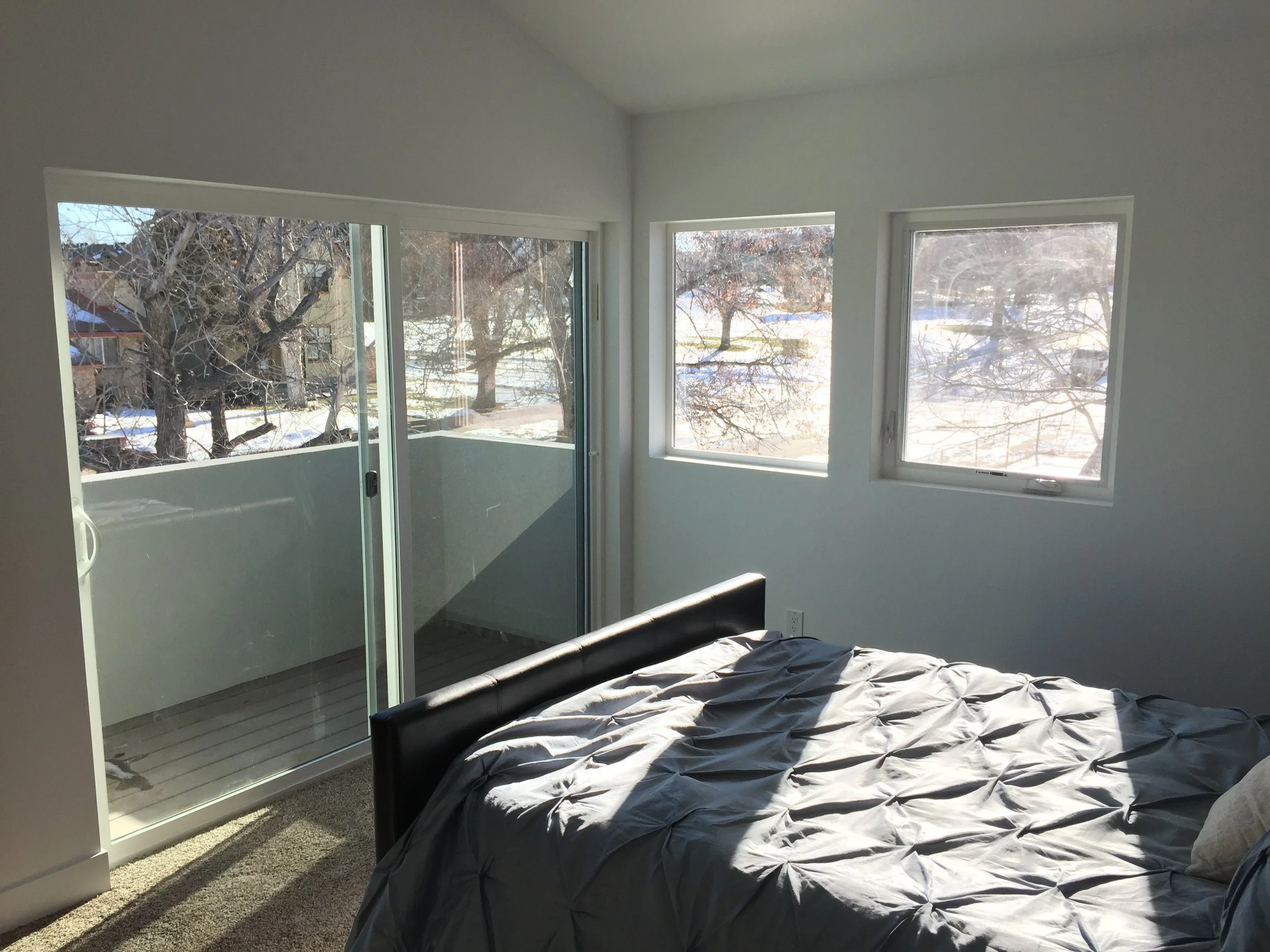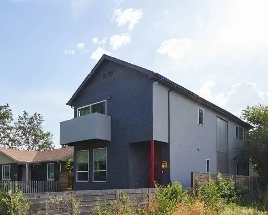 The Cook Residence is a new structure located in central Denver close to City Park. It was designed to fit on a very narrow and long site and attempts to develop an open living floor plan which brings natural light into the central core of the home. There is an immense window opening at the stair that provides a translucent flood of light to the stair and central core and yet maintains privacy for the home. Given the narrow lot, we had just enough space to provide a bump out at the kitchen to provide space for the kitchen cabinets and allow the open floor plan to flow though the kitchen without breaking up the space. We also developed the front living room and the upstairs front primary bedroom suite to take advantage of views to the southeast and to an urban park just a few doors down from this home. There is also a projected balcony off the primary bedroom that capitalizes on the views to the park and an inset entry protecting the front door and adding a splash of color.