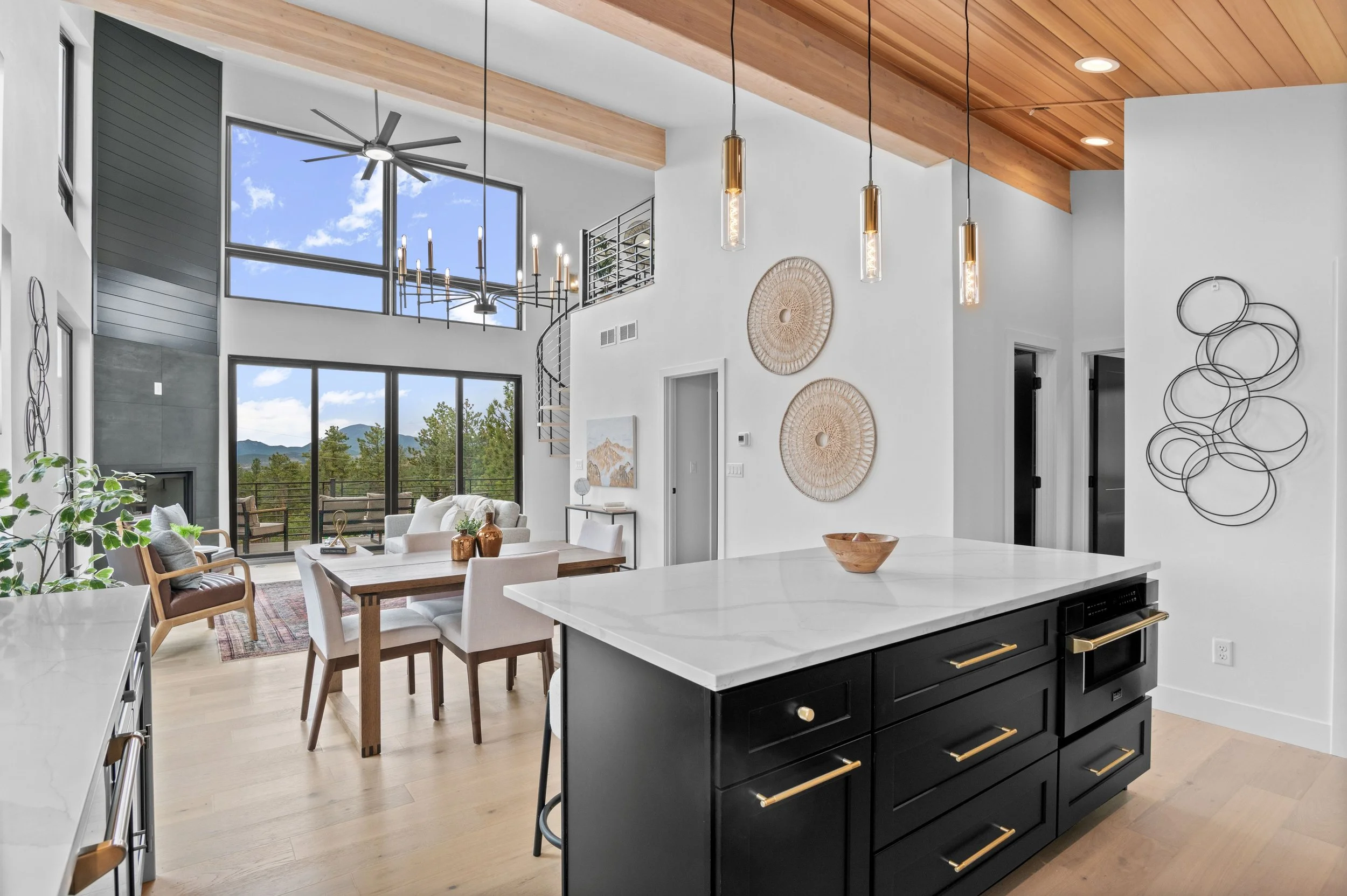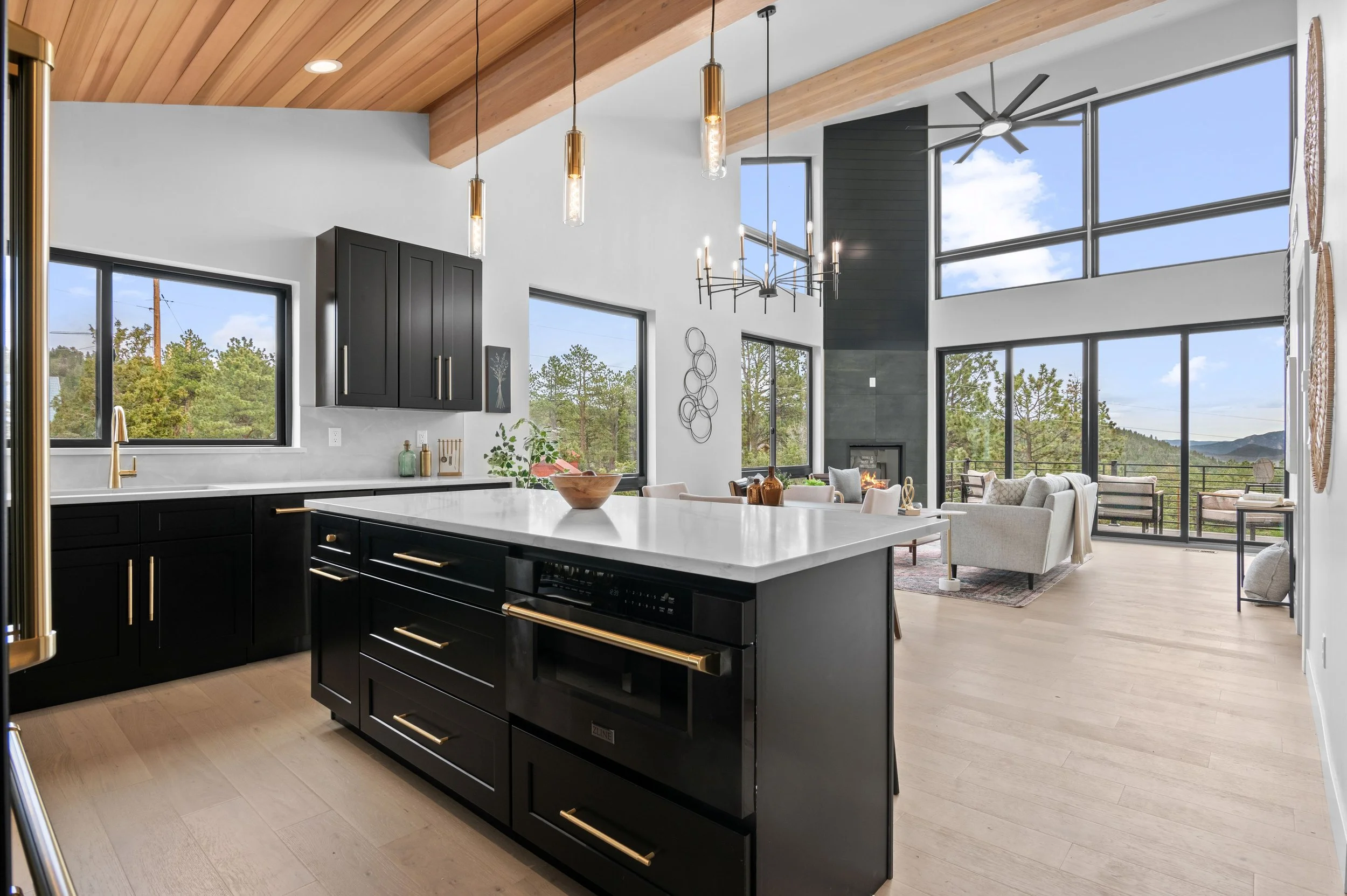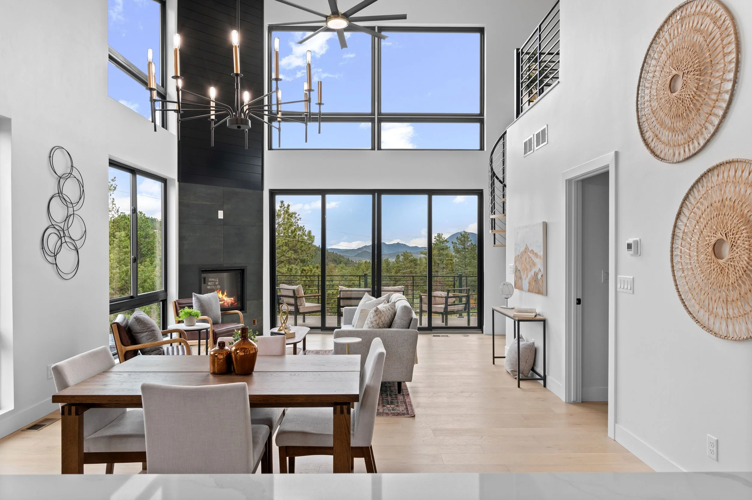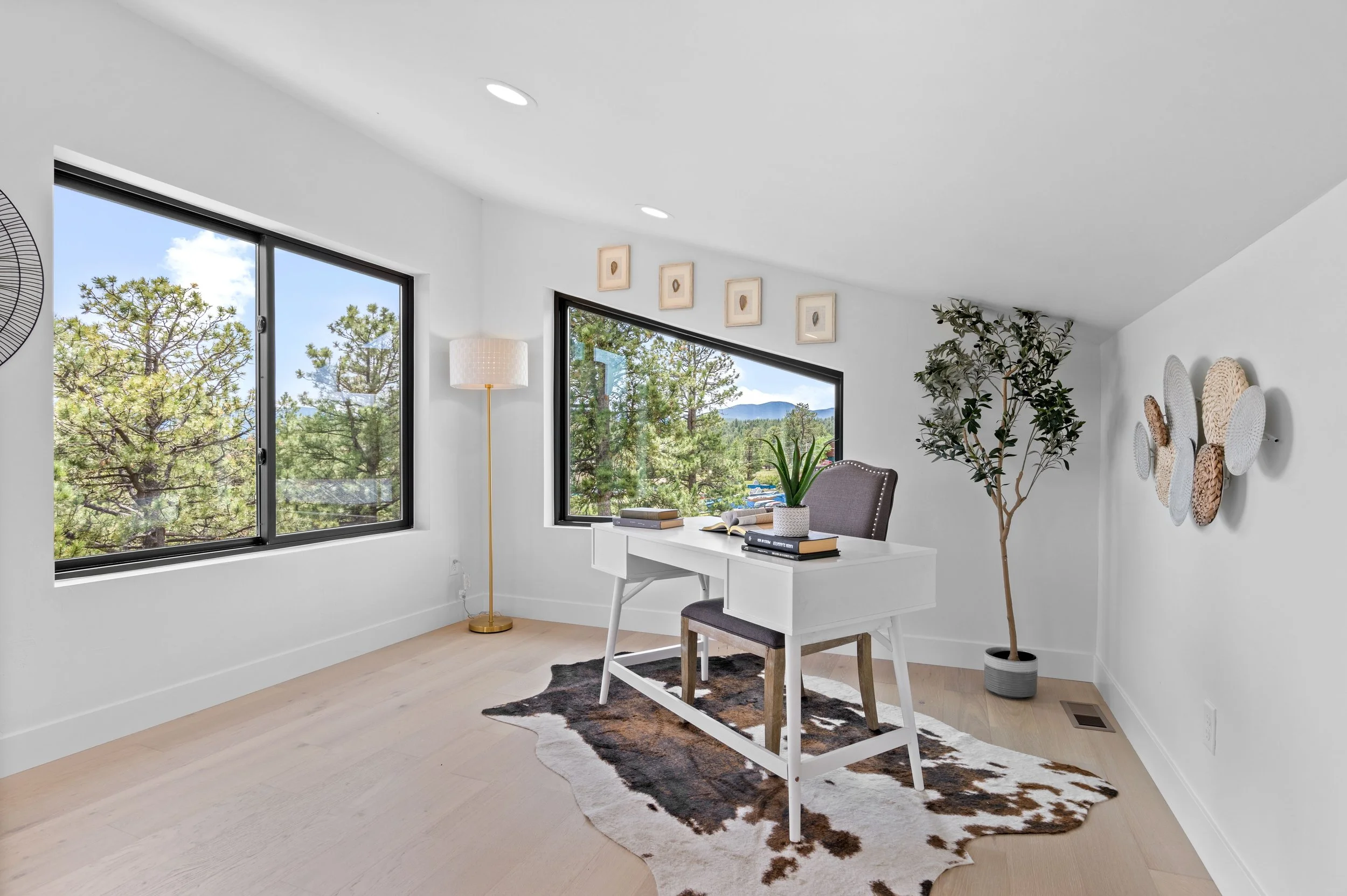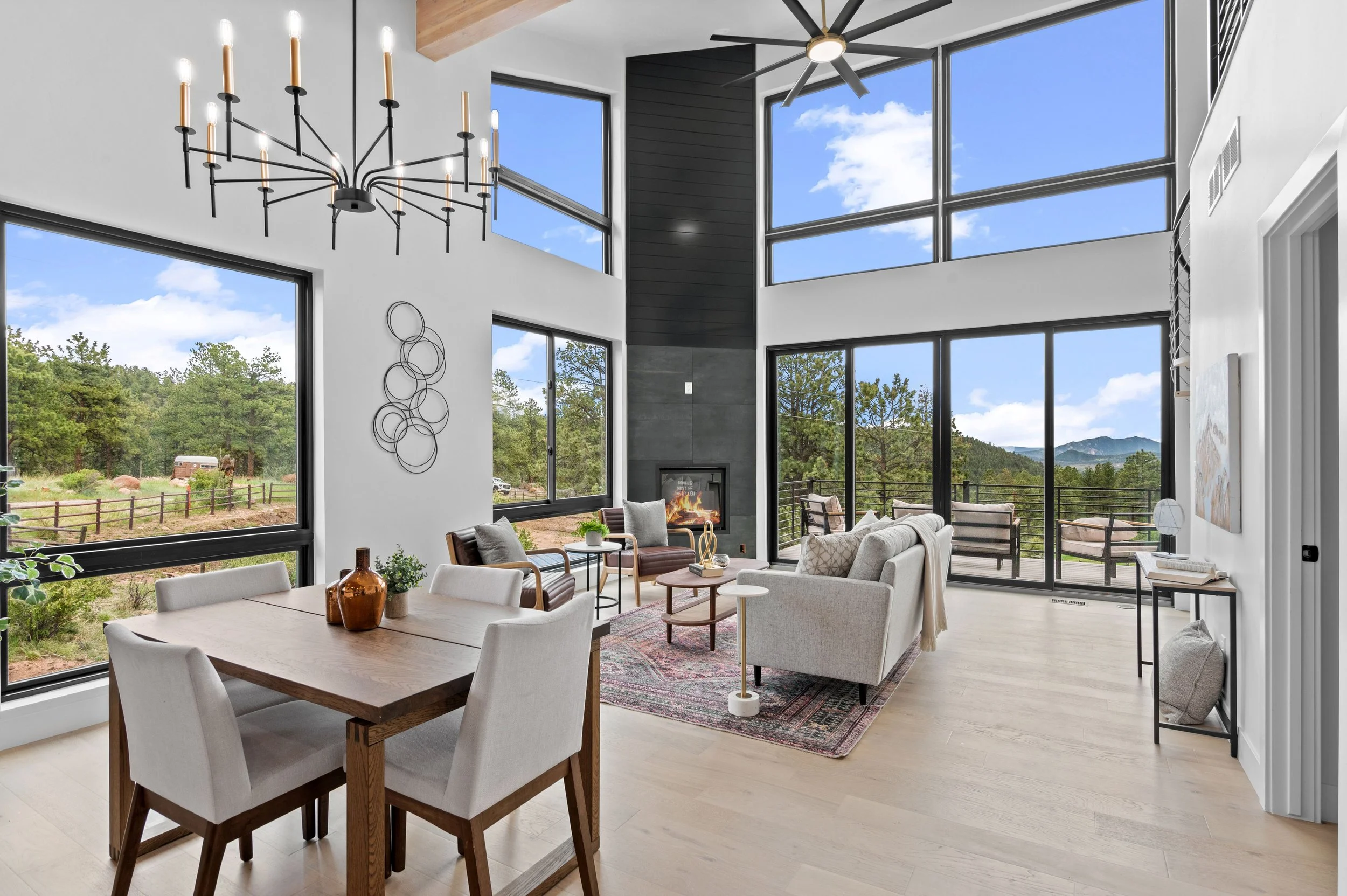 We provided a mountain modern design for the Star Lane Residences in the mountains near Bailey, Colorado. We designed the main living spaces on the second level to capture the mountain views. We created a lofted design to give an expansive feel for a modest house size. The living, dining and kitchen spaces have an open layout with a loft office space. The bedrooms, bathrooms and utility rooms are tucked into the smaller height spaces but flow nicely off the main living spaces..